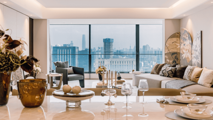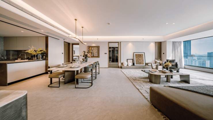 高区样板房以墅级南向大面宽,格局通透,阳光与清风皆邀入室,户内流动四时景致。