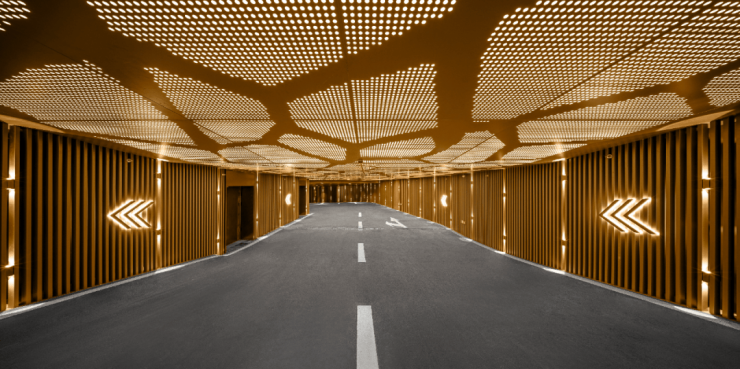 车道位置采用充满艺术造型的冲孔铝板,辅以射灯点缀和墙面双头射灯等设计,呈现秩序之美。