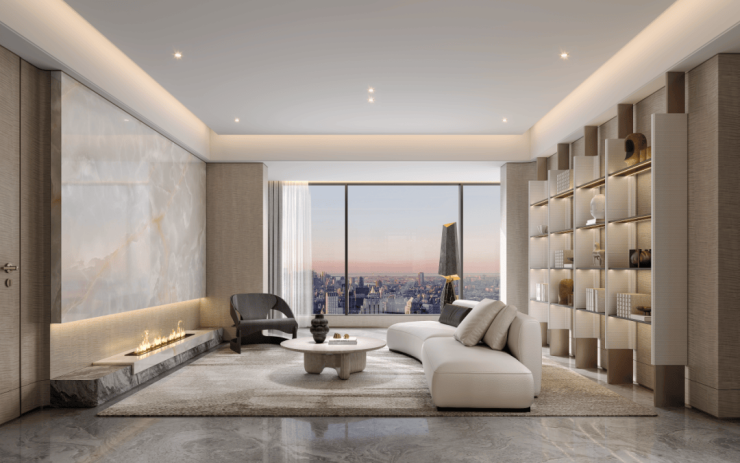 宽广的超级界面、隐奢的气质,通过高墙深院的围合,丰富的精致细节表达出来;仿古铜不锈钢与温德姆灰大理石碰撞出的深沉质感,传递出项目的厚重与典雅,普拉达绿大理石与天青色琉璃的结合彰显产品的隐贵与奢华。