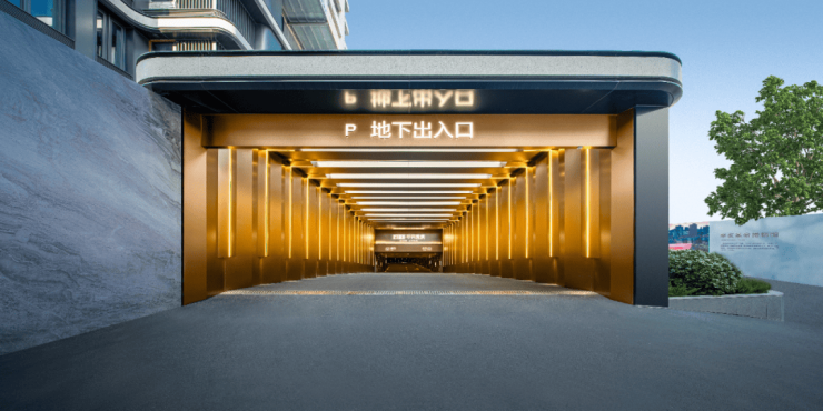 车库出入口的设计风格将现代雅致完美展现。坡道顶部定制了金属格栅天花,勾勒出波浪般丰富的艺术感、层次感;车库入口前区引入自然采光,搭配顶面立面棱角分明的金属折面造型。