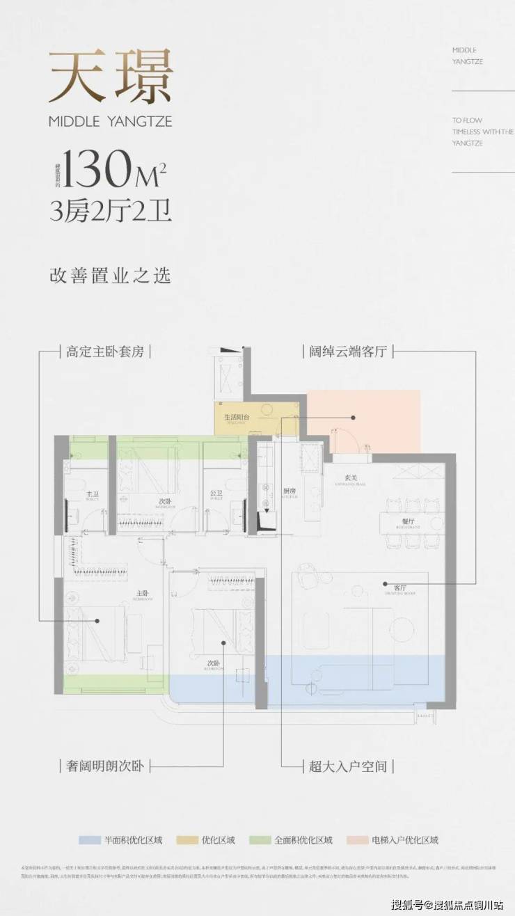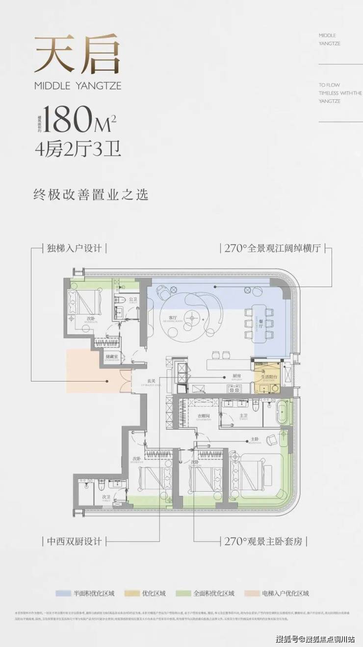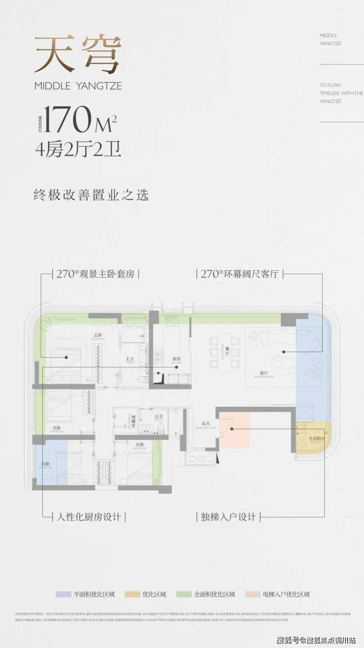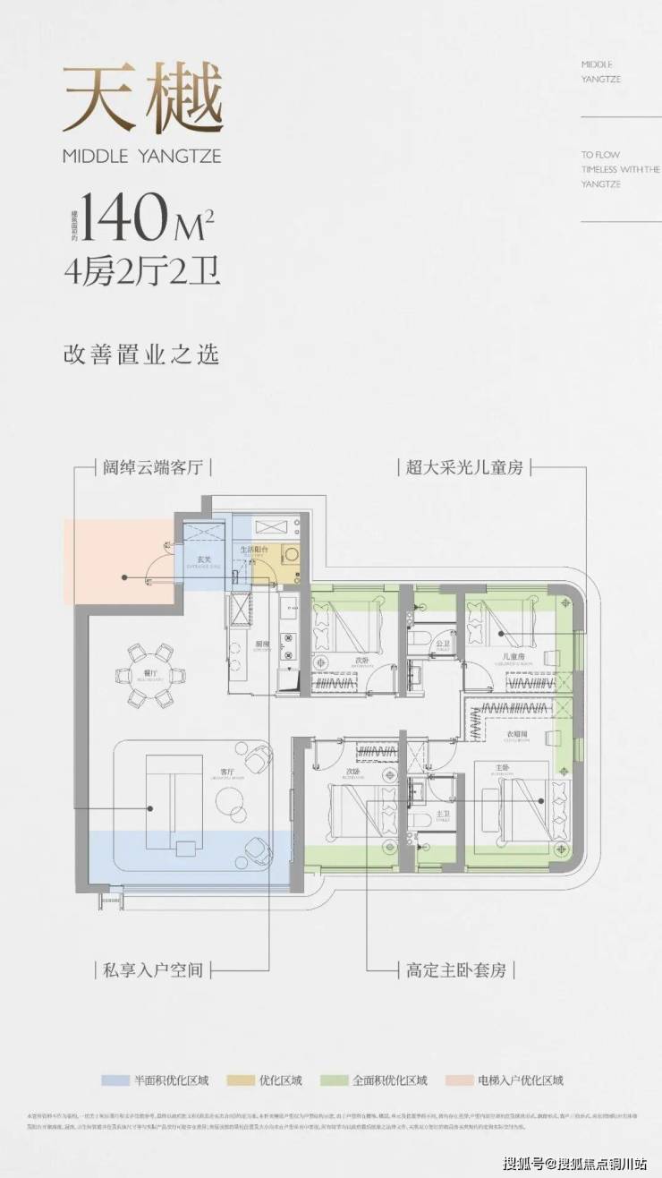 该户型带独立电梯前室,北向270°大阳台可优化一半空间,其它房间(除次卫外)均有飘窗可优化,主卧还有双面飘窗优化空间,厨房外有个空间可优化成生活阳台。