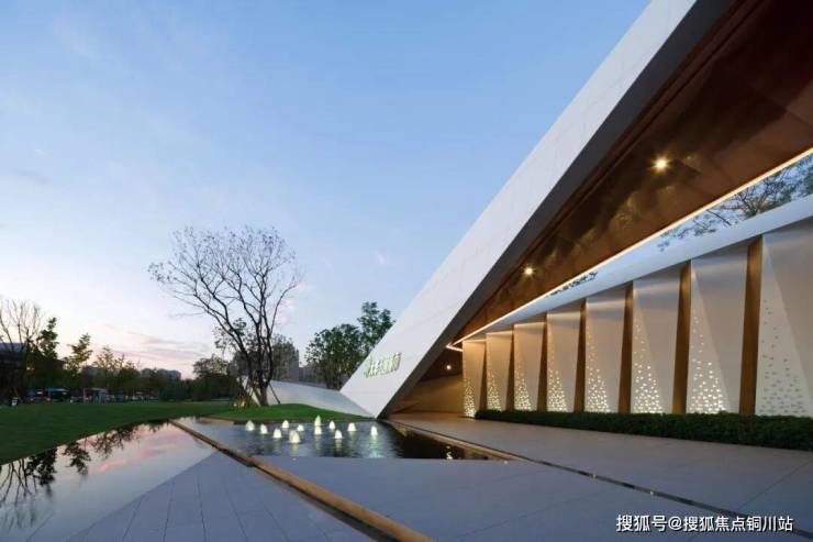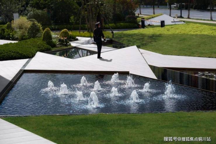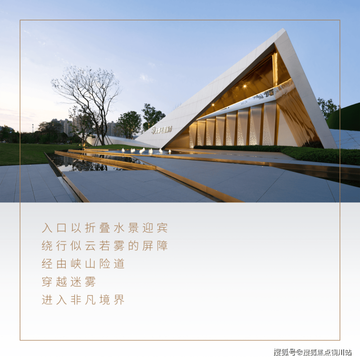 转角设置昭示性水景雕塑,搭配起伏的镂空景墙形成框景。几何感的台阶结合水景,与门廊景墙呼应,拉开出云入境的序幕。