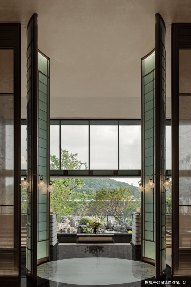 门廊截取寄畅园飞檐翘角,宽庭以仿竹金属格栅重构世家仪轨。御窑金砖铺就归家路,园林泉景精准框入景窗,如古法拓印,落于石庭。泉影琉璃太湖石晨昏叠错,出入间,皆是江南四百年世家风骨。