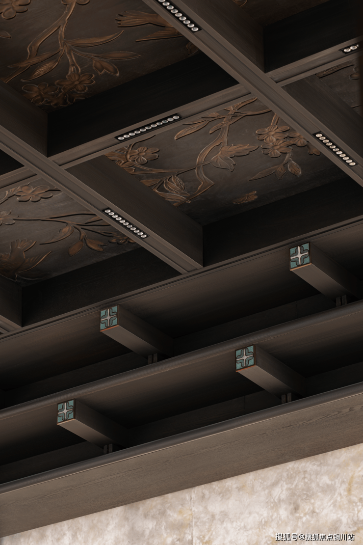 绣品底端的长条框景:借天光裁切庭院竹影,恍若古人遗扇,轻展,即抖落四百年风雅。杜鹃花意,演经为屋顶构件与灯具,令美好延绵于细节之中。