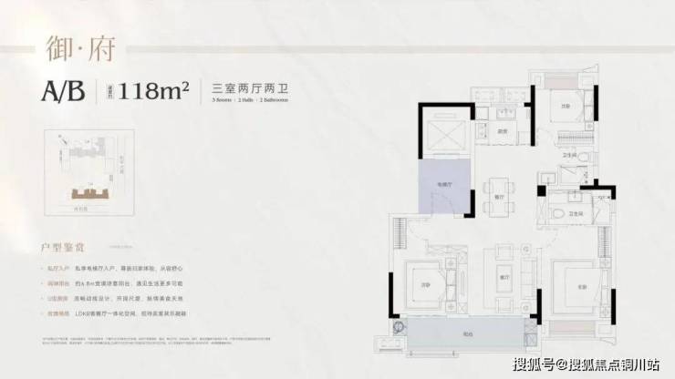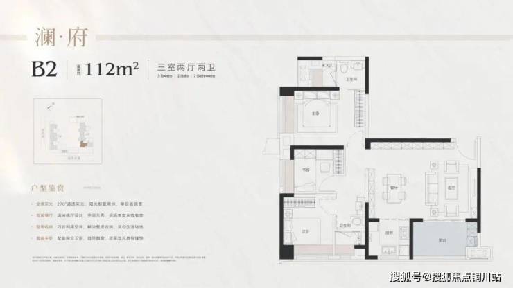 2号楼转角处的112㎡,利用建筑结构的特殊性,把户型设计玩出了华彩,是唯一一个270°全景采光面、大横厅兼具的孤品。