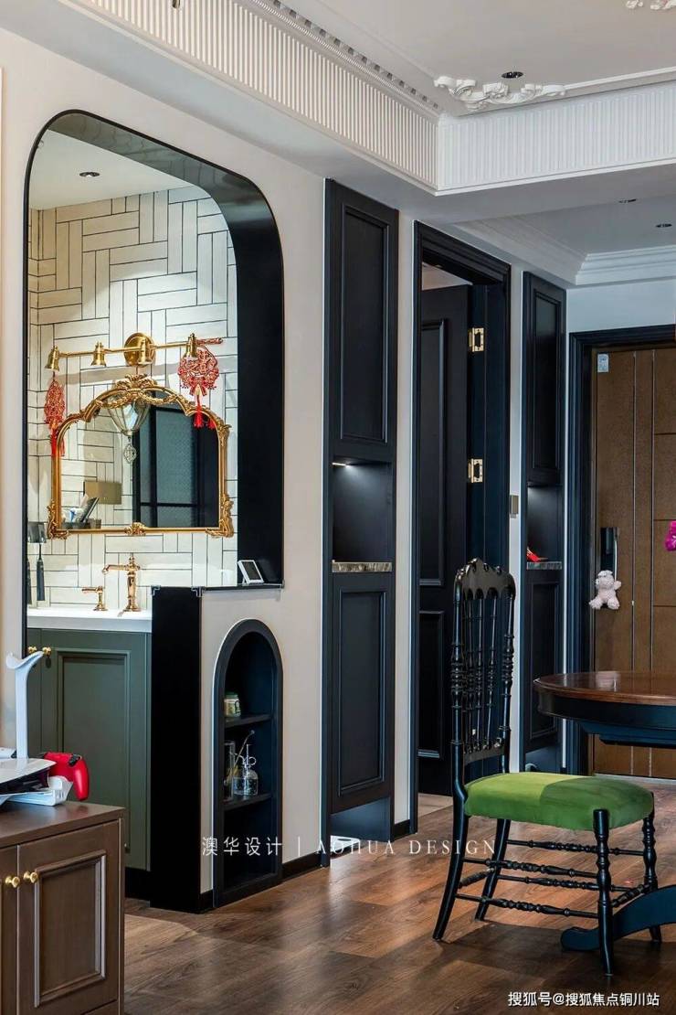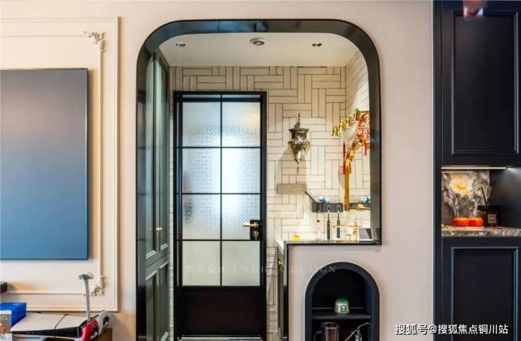 拱门与半墙勾勒的卫生间干区,盈满艺术气息,随手一拍就是大片;洗手台对面,定制家政柜巧纳万象,延展空间收纳美学。