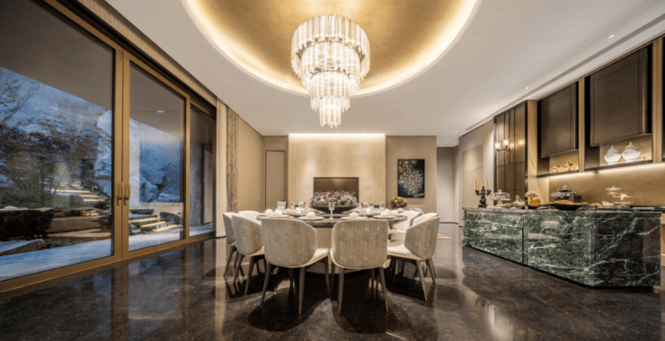 而入户大堂的设计感和空间感同样在线,奢石背景墙、刺绣挂画乃至地面的拼花细节……仪式感纳入生活的每一寸日常。