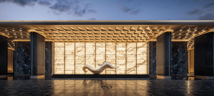 金属铝板门头吊顶、巨幅奢石景墙、如海棠花瓣飘落大师砚台之上的优雅雕塑……充斥着礼序与仪式感的归家入口着实璀璨夺目。
