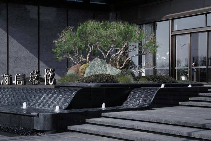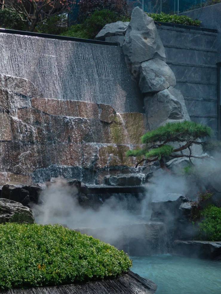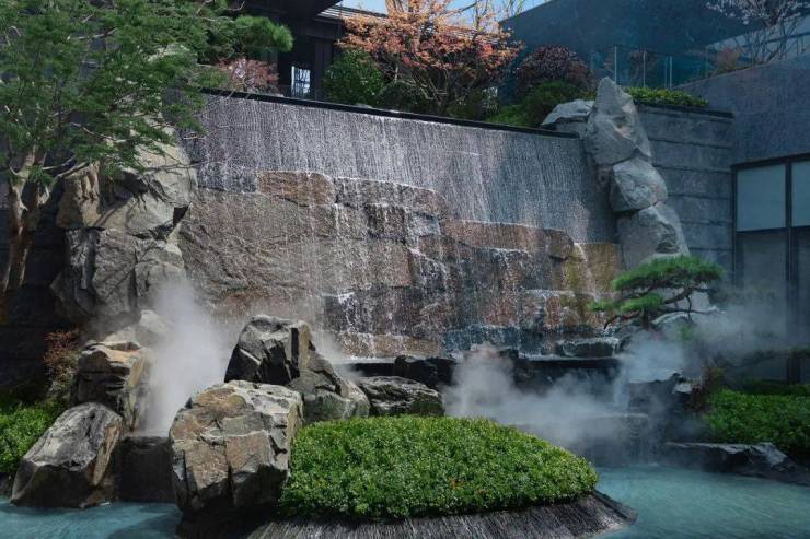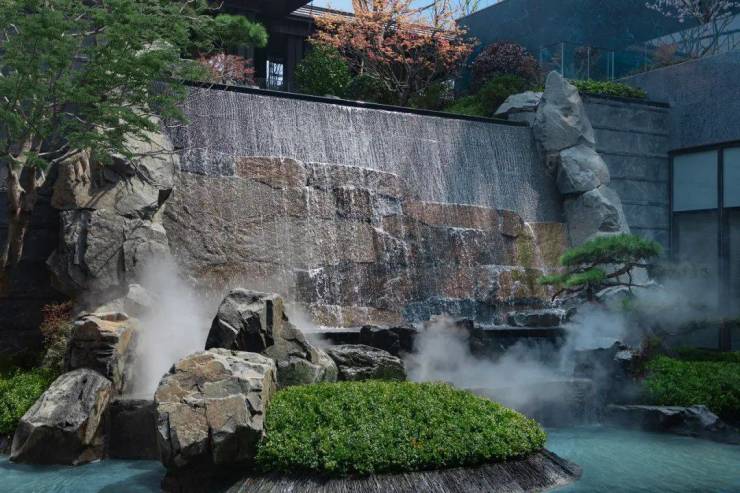 流水瀑布以太行山脉的河北黑景石雕琢,精选乌桕、造型松、红枫及羽毛枫等名贵苗木。瀑布周边种植了多棵象征运开时泰的造型乌桕和象征吉祥如意、鸿运当头的精品红枫,有聚水观林(财),宾客如潮的“高门大园”典故。