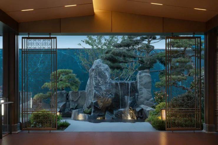 在260㎡下沉庭院中,取崂山名景“九水观瀑”实景,演绎宽10M流水瀑布,串联上下两层水院,从潺潺水声的会客厅,到水墨意境的山石瀑,再到绿岛掩映的静水潭,不管在大堂或是负一层会所都能看到一幅完整的山水画卷。