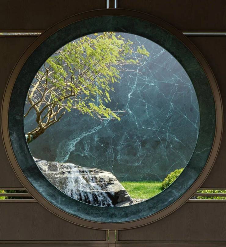 紫薇、苍石通过月洞门入画,双面观进口天然高档石材大花绿玉璧。