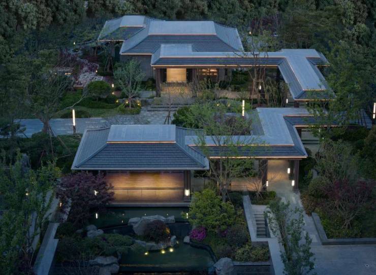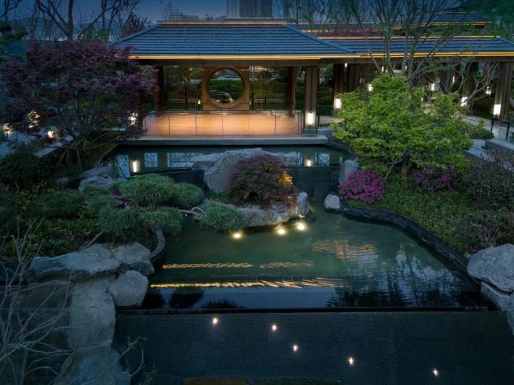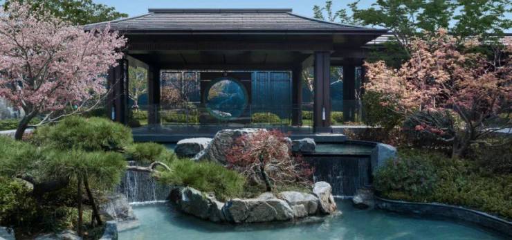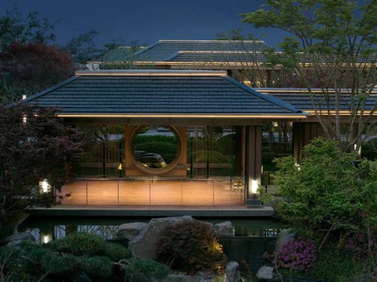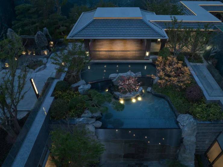 步移景异之中,以构筑、景墙形成框景,游园如观画,以空间礼序诠释东方美学的格局。茶室、园林、连廊、清池、山石,形成轴院布局,层层递进。斜倚亭边美人靠小坐,天光云影,水间锦鲤遨游,营造专属沉浸的自然奢想。
