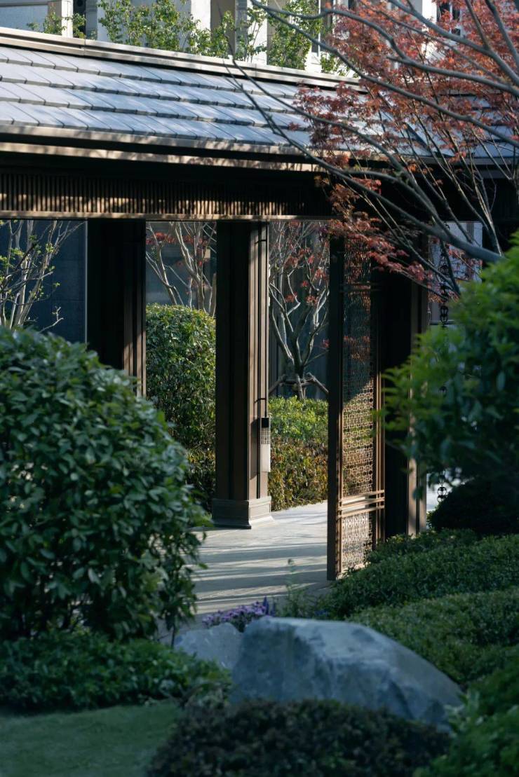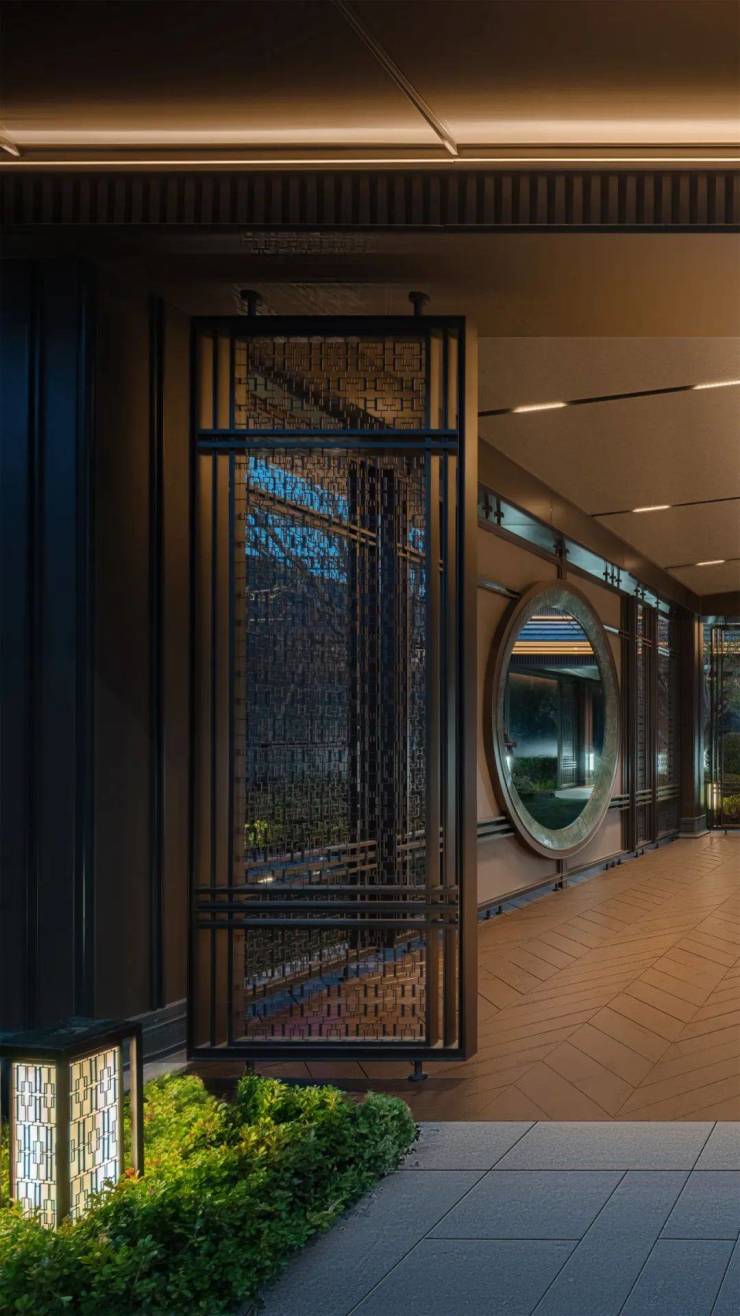 设计将玉石 “步步升锦”演绎在连廊、茶室、灯具、入户、铺装、窗花等细节中,塑造园中有院、院中有园的多维游园体验。