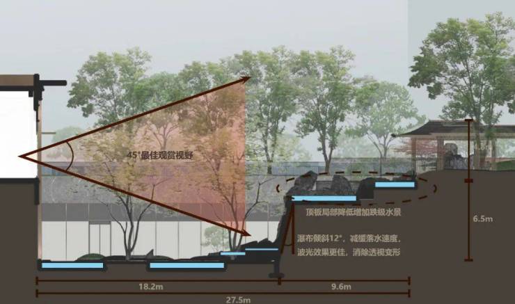 通过利用下沉庭院巨大的竖向高差,打造多层次景观空间,营造生动形态的三层退台。初入印象为流泉叠瀑,以石为山,以流水为川,宽幅流水石屏化解高差带来的压迫感。