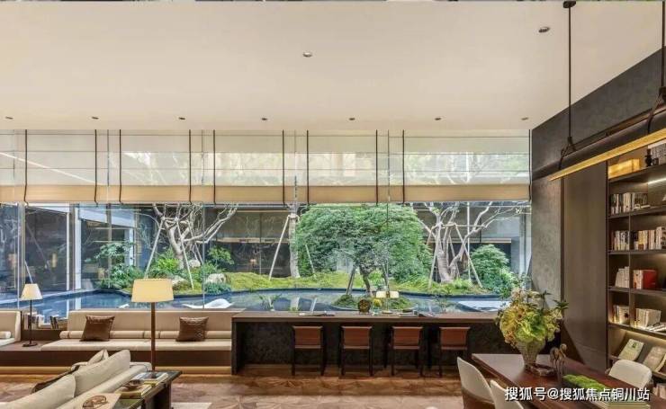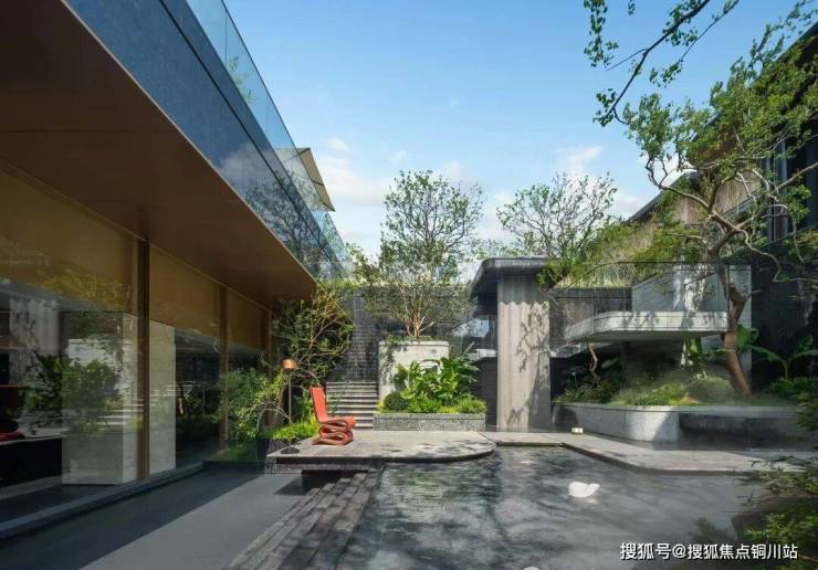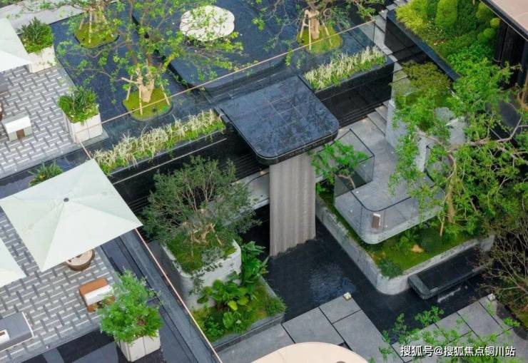 下沉式庭院与一层地面高差达5.2米,巧妙利用高度差与围合设计,打造了一个立体花园,层次鲜明,美不胜收。飞瀑如丝带般串联起地面与下沉空间,辅以阶梯式绿化与错落有致的镜面树池平台,营造出强烈的空间立体感。庭院的选材同样考究,如瀑布两侧挺拔的老桂树与水池中的羽毛枫,不仅美化了环境,更蕴含着美好的寓意,每一处细节都经过精心打磨,品质非凡。