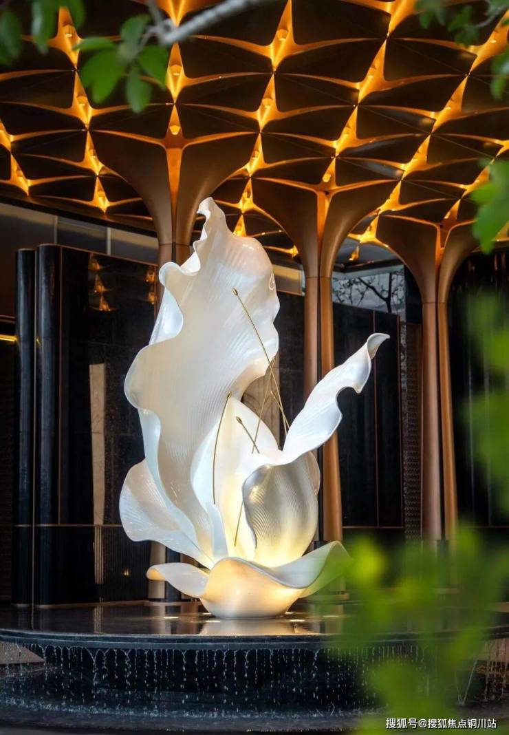 小区大门设计独特,细节之处彰显匠心。门厅之上,金碧辉煌的吊顶由超过200片精雕细琢的百合花瓣拼接而成,支撑其下的,是8根量身定制的百合花柱,中央更有一座巍峨壮观的百合雕塑,百合元素贯穿其中,引人入胜。在材料选择上,尽显奢华质感,精选名贵石材,如入门两侧水景之间铺设的福鼎黑花岗岩地面,景墙则选用了宝格丽绿石材搭配金属格栅,并以进口幻影蓝石材和白雪公主玉石巧妙点缀,尽显高贵气质。