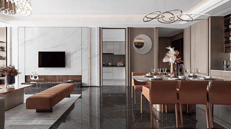 奢阔的空间格局,容纳尊贵人生的所有想象,将别墅级的享受扁平化,餐客一体化设计,让客厅不仅仅是家居空间,更是商务洽谈、家族聚会的新场域。