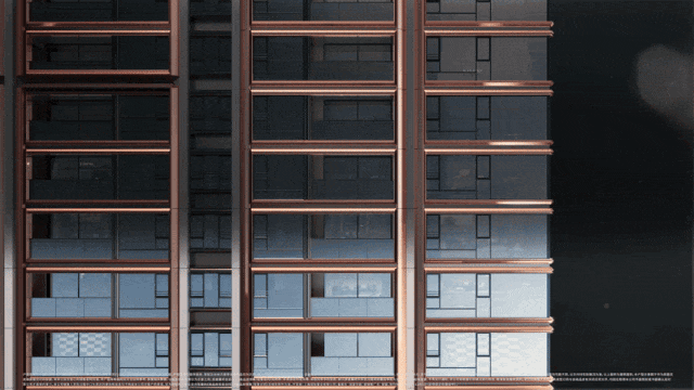 整体立面取用了上海城市色调,颜色以暗铜色,香槟金、高级灰为主,融合类奢侈品配色理念,融入现代审美元素,赋予建筑松弛精致的质感。