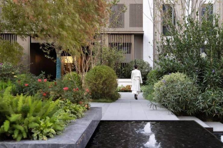 入则宁静,绿 洲花园以花园里的公馆为主题,植物是花园的主角。 素有“祥瑞”之称的榉树作为行道树威仪迎宾,单元入户两侧的紫薇寓意繁华富贵,丰富多彩的地被植物更是为整个花园铺上一层繁花似锦的基底,花园中心阳光草坪边缘层叠的水景之上是一棵造型飘逸的羽毛枫,成为整个花园的视觉焦点。