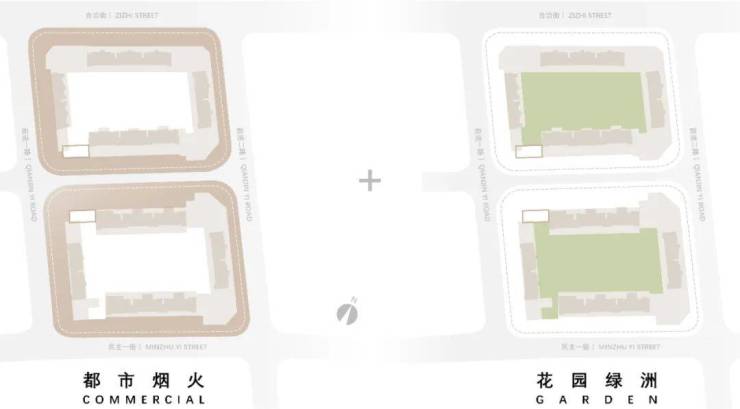 因此更新后的社区以“绍兴里1921”致敬过往,在同一片土地上,仿佛看到百年之前代表着当时此地最洋气、繁华、宜居的生活方式。如今作为城市历史文化片区更新样板,我们思考的是传承与创新,传承的是这独有的腔调与情调并存的生活,创造的是满足当代社会生活与精神需求的宜居环境,重生后的绍兴里1921由“烟火商业”与“绿洲花园”两部分组成, 沿街商业出则繁华,住区花园入则宁静,在百年之后的今天重启绍兴里这扇文化名片的大门。