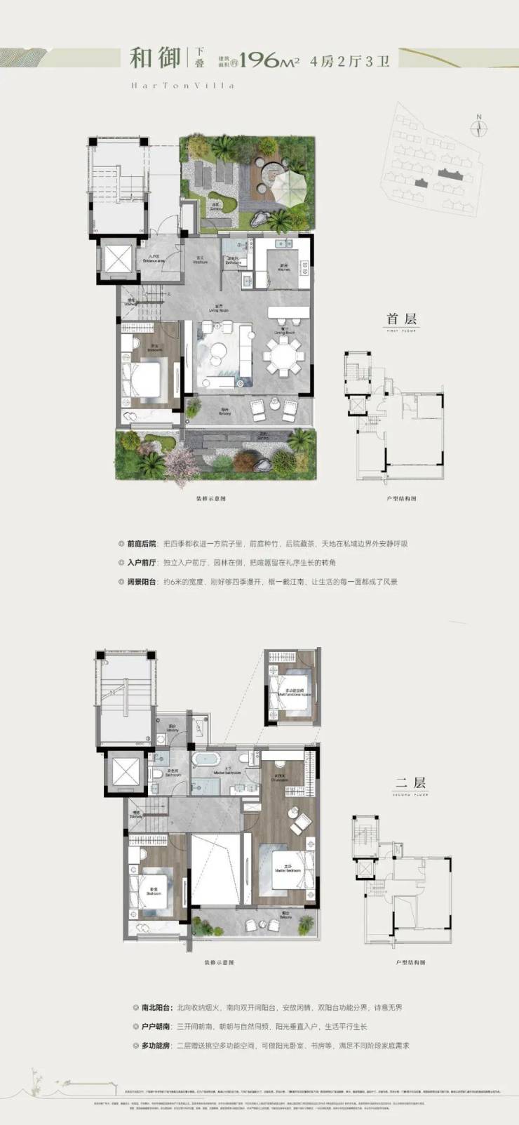 下叠167/196㎡:前庭后院围合私密天地,LDKG一体化横厅串联南北双阳台,主卧套房配备双台盆与步入式衣帽间,生活尺度媲美联排。