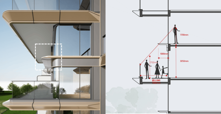 在设计初即考虑在上下层之间,增加了1米的遮光挡板,减少奇偶层上下对视的问题。