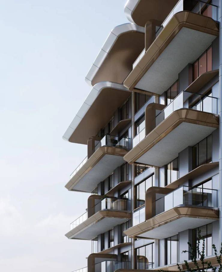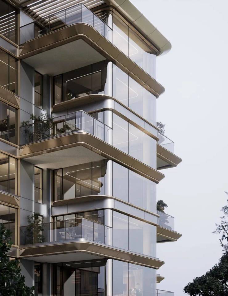 峯境叁號院的建筑立面设计调性别具一格,整体呈现晶莹轻盈、未来感十足的游艇美学外立面,理念致敬全球建筑大师扎哈·哈迪德的迪拜四代顶豪The Alba,双浮岛大露台+客厅主卧双弧度转角的设计拥抱生活希冀的徐徐风景,珠光古铜色铝板和玻璃幕墙是主要材质,结合深灰色铝板、银白色铝板,勾勒出顶级豪宅品质的立面美学。