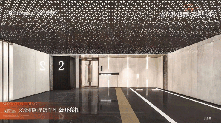 再来看地下车库,主车道顶部采用古铜色格栅吊顶,净高约2.5米,很是气派;落客区一整面的冰川白玉岩板,非常抢眼!
