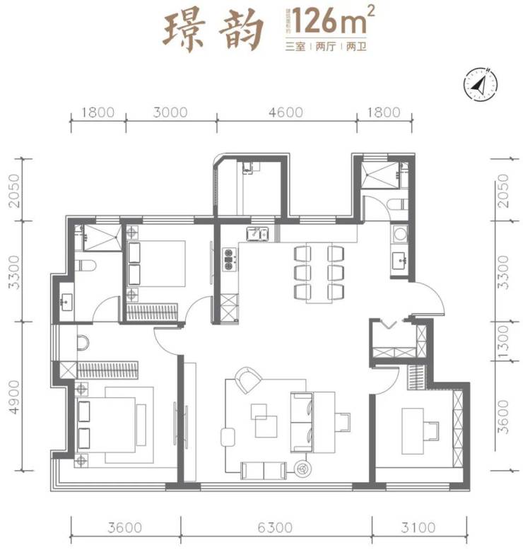再看建面约126㎡三室两厅两卫户型。