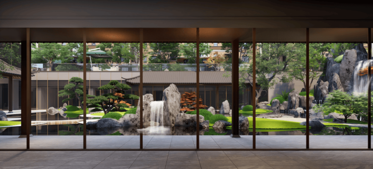 中央水系将日式枯山水的白沙、置石、苔藓、红枫,与中式蜿蜒水系相融合。