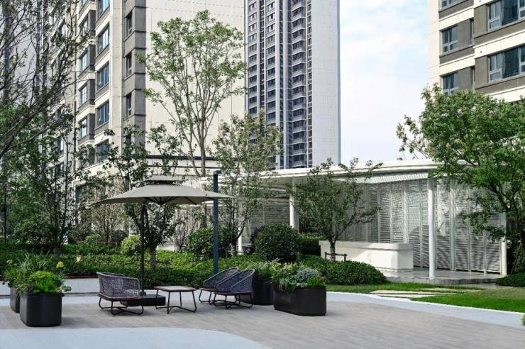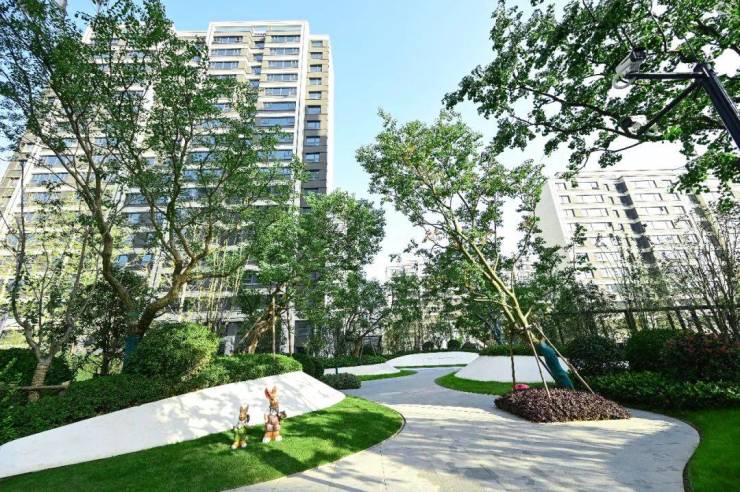 最后,是它的绿化景观非常精致丰富。白色石质的景墙、饱满的坡度、圆润的曲面……海棠、枫树、石榴、绣球、黄金菊、桂花等组成的高大树种、灌木、乔木,错落有致。