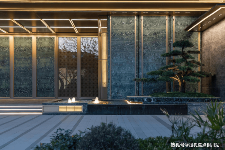 景致先迎,匠造于微。入口88m超横屏月映绮门,以范思哲黑、普拉达绿等石材为基底。两侧甄选造型罗汉松与名贵乔木,以 “错落式定位” 分层排布 ,强化空间纵深感。整体对称布局,让居者在归家瞬间,感受到现代奢宅的仪式感与东方美学的文化根脉。