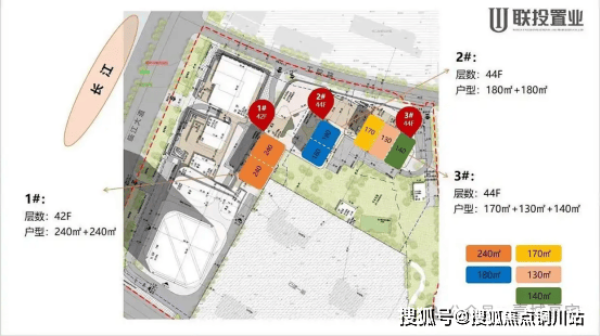 联投长江天元三栋住宅错落排布,江距从小到大依次分别是: 1号楼、2号楼、3号楼,头排商业楼层较矮,1、2号楼大部分房源都可以无遮挡观江,3号房源中170平的户型基本也能看江。
