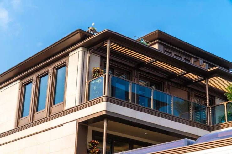 立面选用米黄色石材、深灰色瓦屋面,辅以大量LOW-E中空玻璃、古铜色铝合金线条与玻璃栏杆,既显现代挺拔,亦存传统温润。