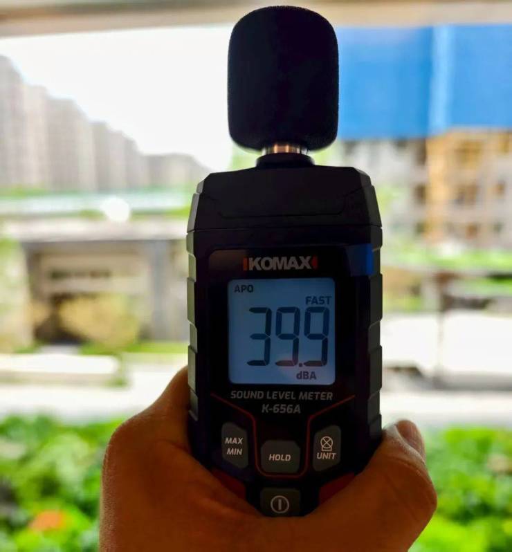 售楼处公开之后,F哥就带着分贝仪到现场进行了检测,测了之后发现四层夹胶玻璃果然厉害。