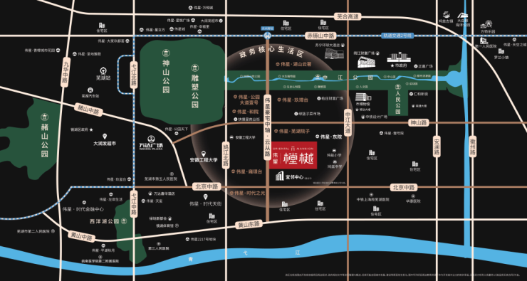 中轴,顾名思义,它划界一座城市的中心格局,集萃一座城市的优质配套资源,也展示了一座城市的封面形象。上海·浦明路,上海最贵1英里,擎画陆家嘴的繁盛图景;南京·江东路,划定河西CBD中轴,成就鱼嘴湾区豪宅资产封面;而在芜湖,它叫云从路,我们亦称之为伟星豪宅中轴,它是云从路另一个身份,也见证、承载着这条路的荣光和高度。