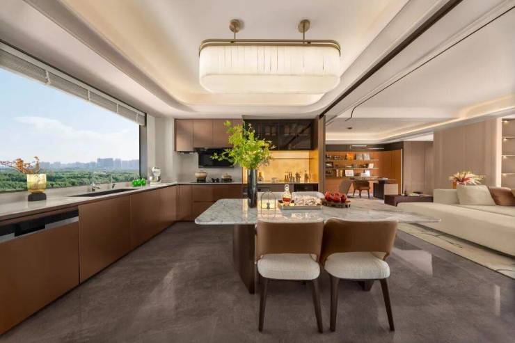 设计师还巧妙利用“横向延展+纵向通透”的复合策略,将传统豪宅的“厅室分离”升维为“无界交互场域”——父母在厨房备餐时可与客厅玩耍的孩子互动,书房与客厅的玻璃隔断则兼顾办公隐私与家庭陪伴。