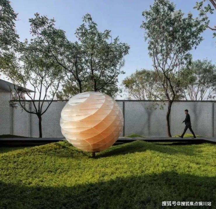 当这条光河流达终点,呈现的便是日出江河的中间庭院景象,半透明橙色球体如同太阳一样自西向东缓缓自转着,并在满园的葱郁绿意中缓缓升起,如同旭日东升,从中心向外弥漫的色彩在波形材质的光线干涉下,呈现出一种神秘感,为静态的中庭空间增添了时间维度。