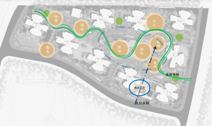 溪屿组团毗邻梁滩河生态走廊,是一片生长在河边的土地,项目设计结合地理特色,在设计理念上将梁滩河引河入园,形成东西走向的溪涧生活场景,让业主感受溪林间的闲适生活。实现“不出城廓而获绿林之怡,身居闹市而得清溪 之趣”。同时,项目还融入了轻舟理念,将归家演变成一场带有悠闲气息的度假之旅。轻舟缓缓行驶于静谧的溪涧之中,清澈的水流倒映着周围的绿色植被,宛如一幅动态的自然画卷。