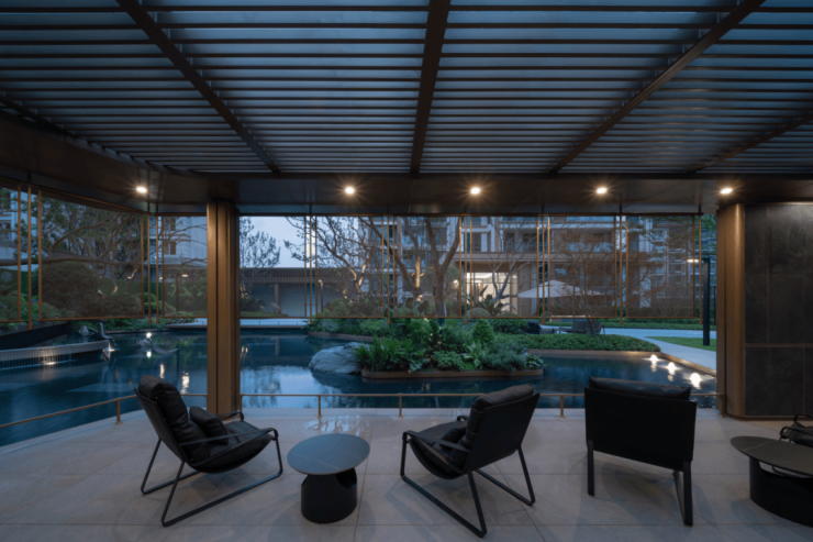The exquisite and private atrium living room uses the dynamics of flowing water and the participation of nature, supplemented by exquisite murals, metal texture and natural stone, and the sense of art and functionality complement each other. The rotatable grille pergola, metal fine woven roller blinds and hollow sun roof form an open interactive space, where you can enjoy the water on one side and the garden on the other. Between light and shadow, it is exquisite and natural.