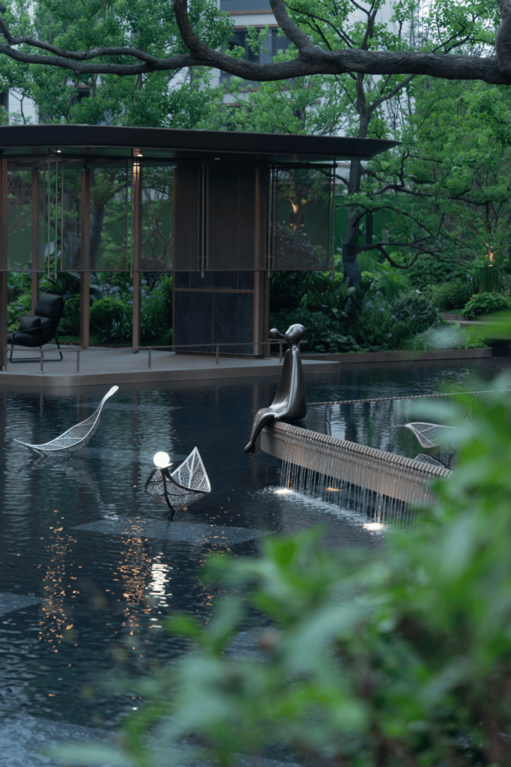 精致跌水上,金属人物雕塑悠然闲坐,营造悠闲轻松的度假感,还原生活本真的静谧。
