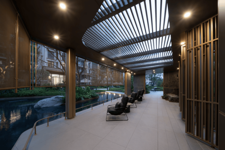 精致私享的中庭会客厅,利用流水的动态和自然的参与辅以精致壁画、金属质感与自然石材的组合,艺术感和功能性相辅相成。可旋转格栅廊架、金属细织卷帘及镂空阳光顶,形成开敞互动空间,一侧观水、一侧赏园,在光影间,精致而不失自然之趣。
