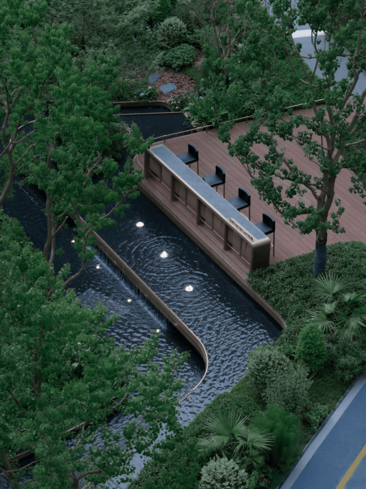 Xiyu Group is adjacent to the Liangtan River Ecological Corridor. It is a piece of land growing by the river. The project design combines geographical characteristics. In terms of design concept, the Liangtan River is diverted into the park to form an east-west stream life scene, allowing owners to experience the leisurely life in the stream and forest. It realizes "getting the pleasure of green forests without leaving the city, and getting the fun of clear streams in the downtown". At the same time, the project also incorporates the concept of light boats, turning home into a leisurely holiday trip. The light boat slowly travels in the quiet stream, and the clear water reflects the surrounding green vegetation, like a dynamic natural painting.