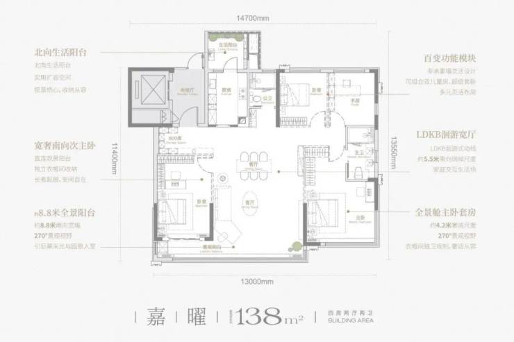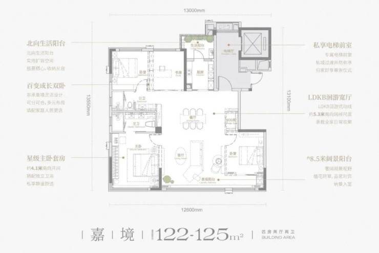 项目打造建面约102-138㎡舒适三房、阔景四房全改善产品线,以超高得房率为基础,全系户型遵循「南向面宽最大化 + 南北双阳台 + 独立电梯厅入户 + 灵活空间可变 + 超大赠送空间」的核心设计原则,精准适配全龄家庭的成长所需。