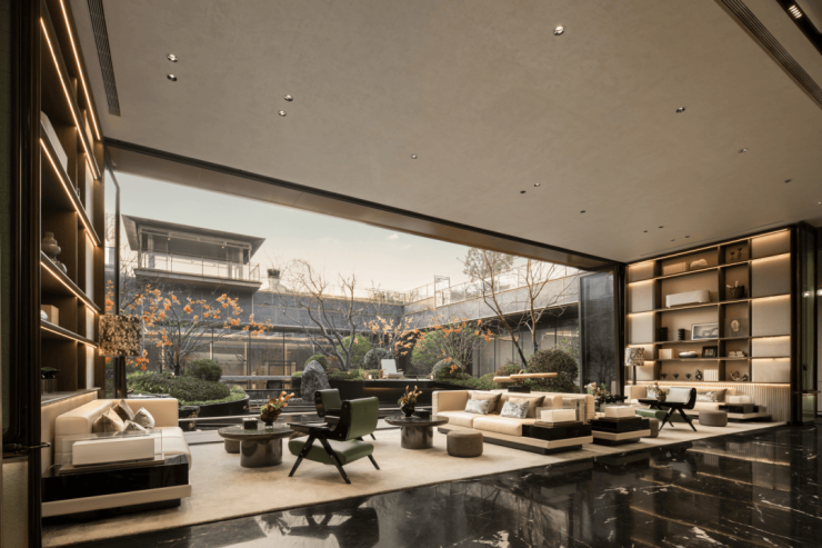 往里走,穿过约200㎡的漂浮感水院,还有以宋式园林为蓝本的下沉式庭院景观,名贵树种、叠石和造型小品,被设计“漂浮”于水景之上,站在一旁的连廊下,一抬头、一转身,都能有不一样的景致。