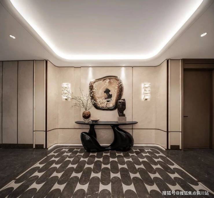 入户之后,眼前便是一座世家大院的“照壁”式玄关,双弧形皮革屏风,水刀切割的拼花石材,将家的温馨与豪宅的尊贵感巧妙同框。