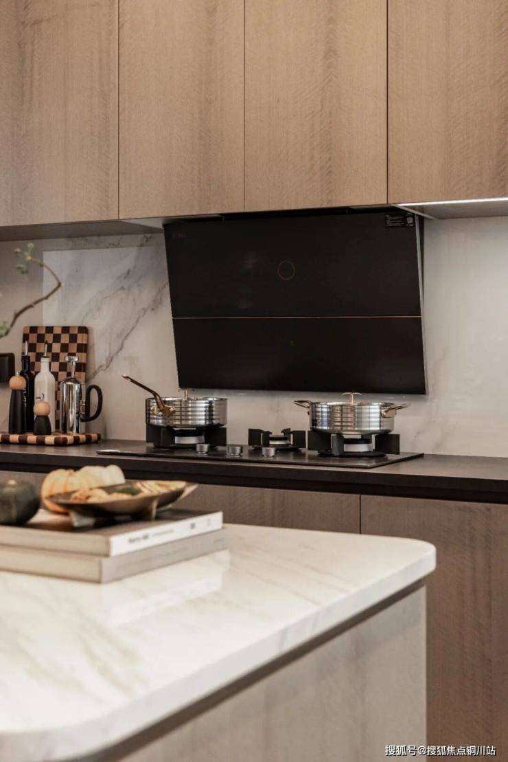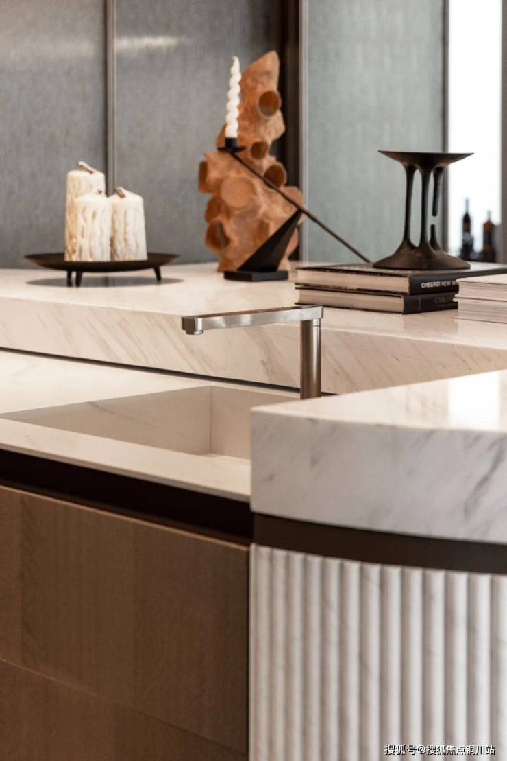 以餐厅的岛台为例。该岛台台面不但设计有动轨道,台面之下内置电动升降龙头,甚至既通水又通电,可洗菜、可烘焙,可自酿鸡尾酒,可自研咖啡,以其强大功能自可加冕全宁波首席岛台!