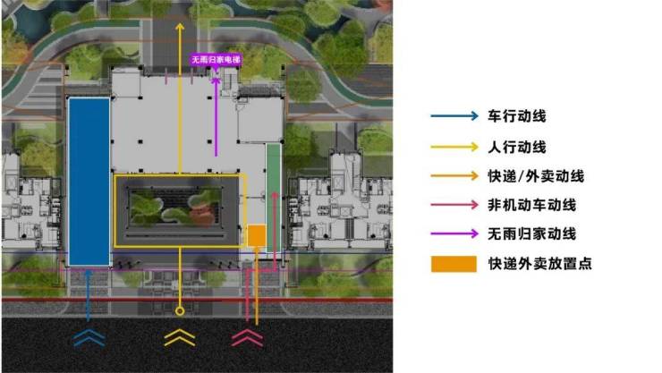 此外,社区大堂内部还打造了无雨归家电梯,遇到大雨天、风雪天,业主可乘坐电梯至地库,实现无雨归家。