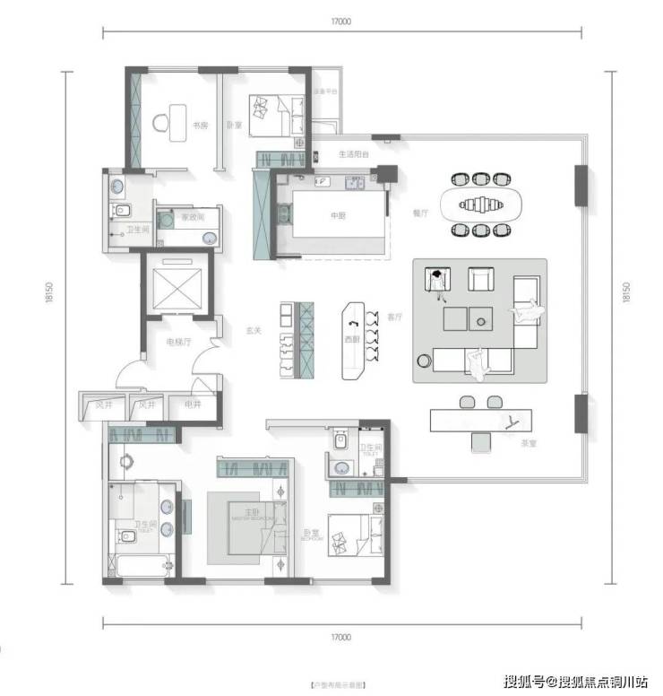 225㎡,客餐厅达到了120㎡,三面采光,7米IMAX环景宽厅,天幕级视野,270°无界观景,视野无敌。