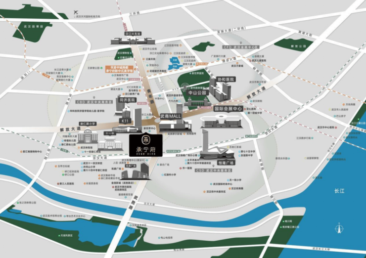 汉口内环沿着解放大道、武胜路向外扩圈,在商务浓度堪称巅峰的1公里直径里,城市级地标、第一梯队的商圈,映入眼帘。